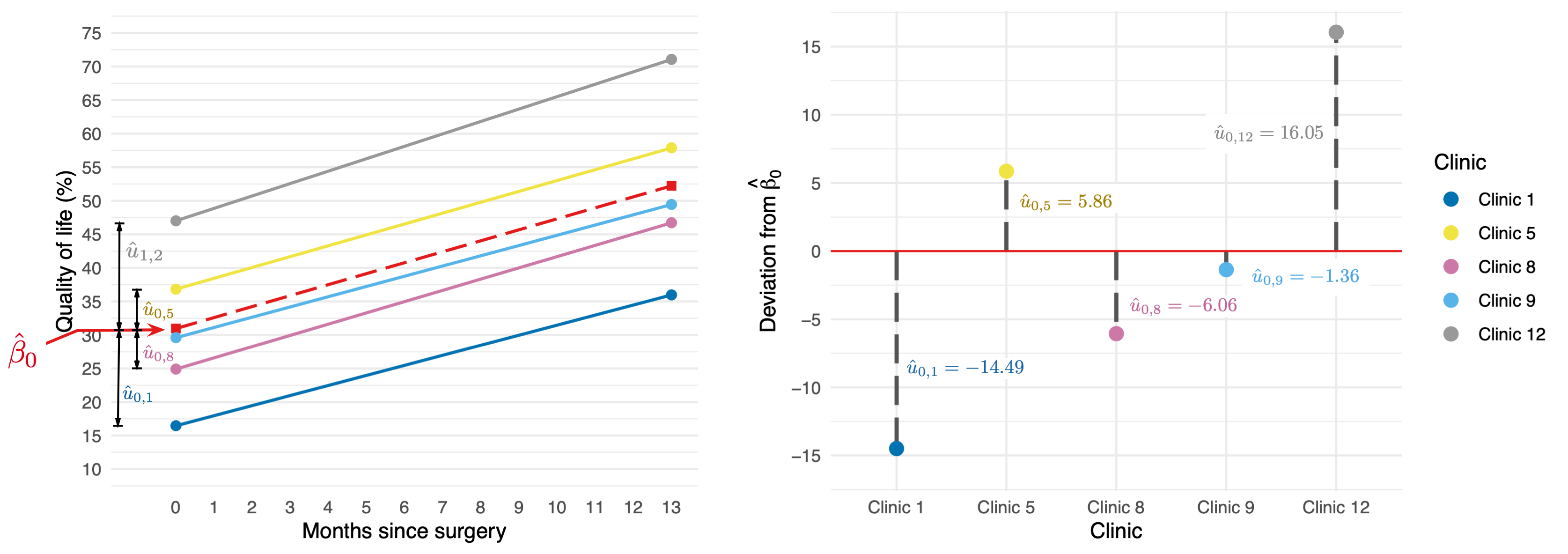 \[ \begin{aligned} \text{QoL}_{ij} &= \beta_{0j} + \beta_1\text{Days}_{ij} + \varepsilon_{ij} \\ \beta_{0j} &= \beta_0 + u_{0j} \\ \end{aligned} \]
