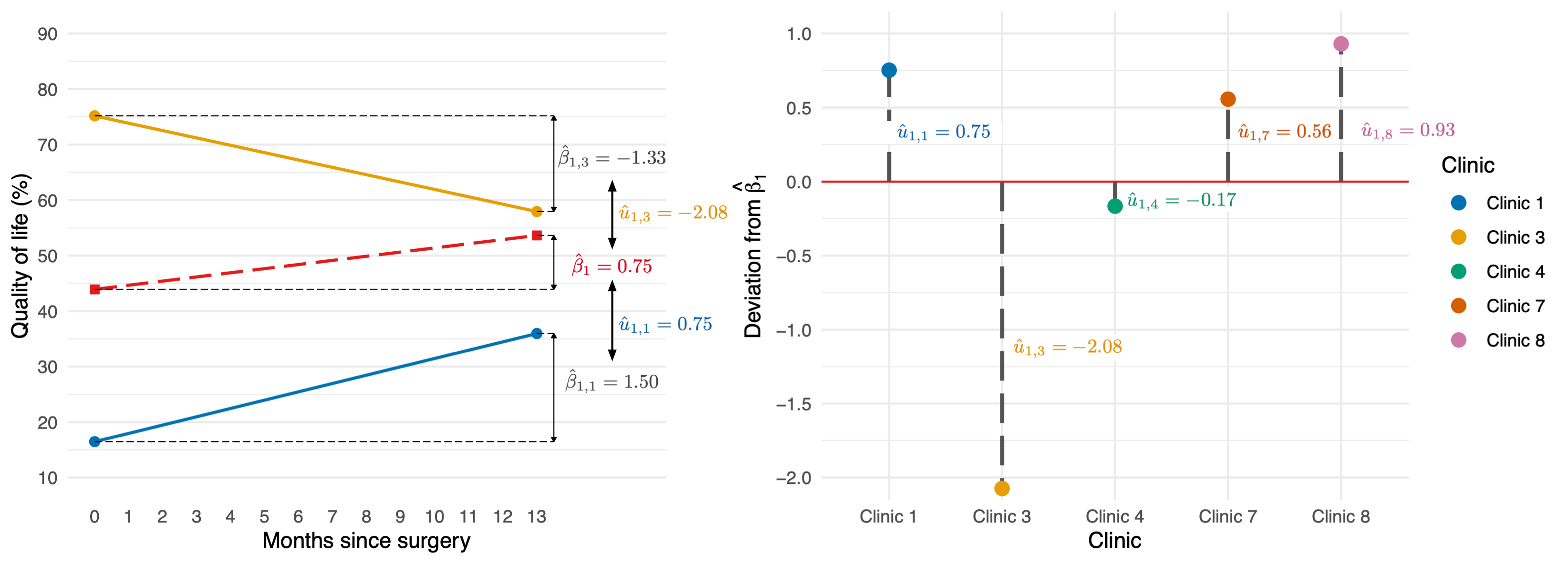 \[ \begin{aligned} \text{QoL}_{ij} &= (\beta_0 + u_{0j}) + (\beta_1 + u_{1j})\text{Days}_{ij} + \varepsilon_{ij} \\ \text{QoL}_{ij} &= [\beta_0 + \beta_1\text{Days}_{ij}] + [u_{0j} + u_{1j}\text{Days}_{ij} + \varepsilon_{ij}] \\ \end{aligned} \]