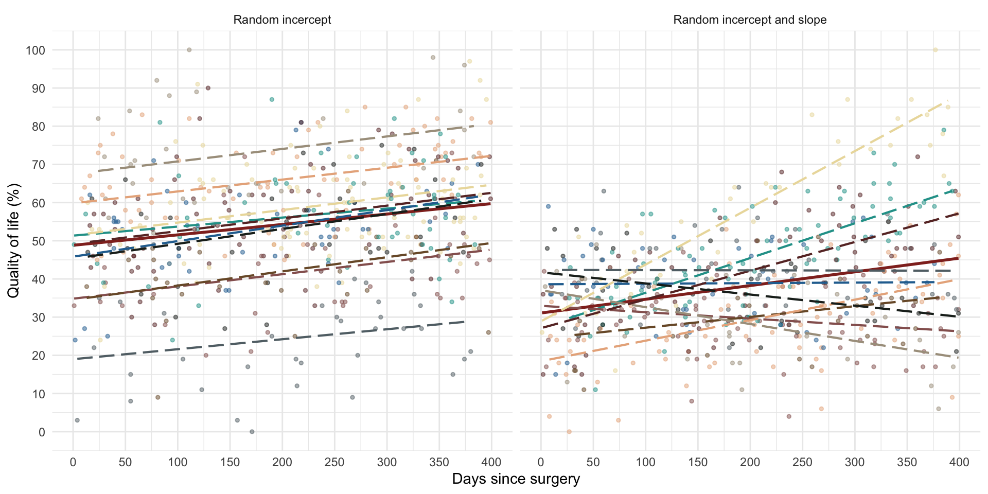 \[ \begin{aligned} \text{QoL}_{ij} &= [\beta_0 + \beta_1\text{Days}_{ij}] + [u_{0j} + u_{1j}\text{Days}_{ij} + \varepsilon_{ij}] \\ \end{aligned} \]
