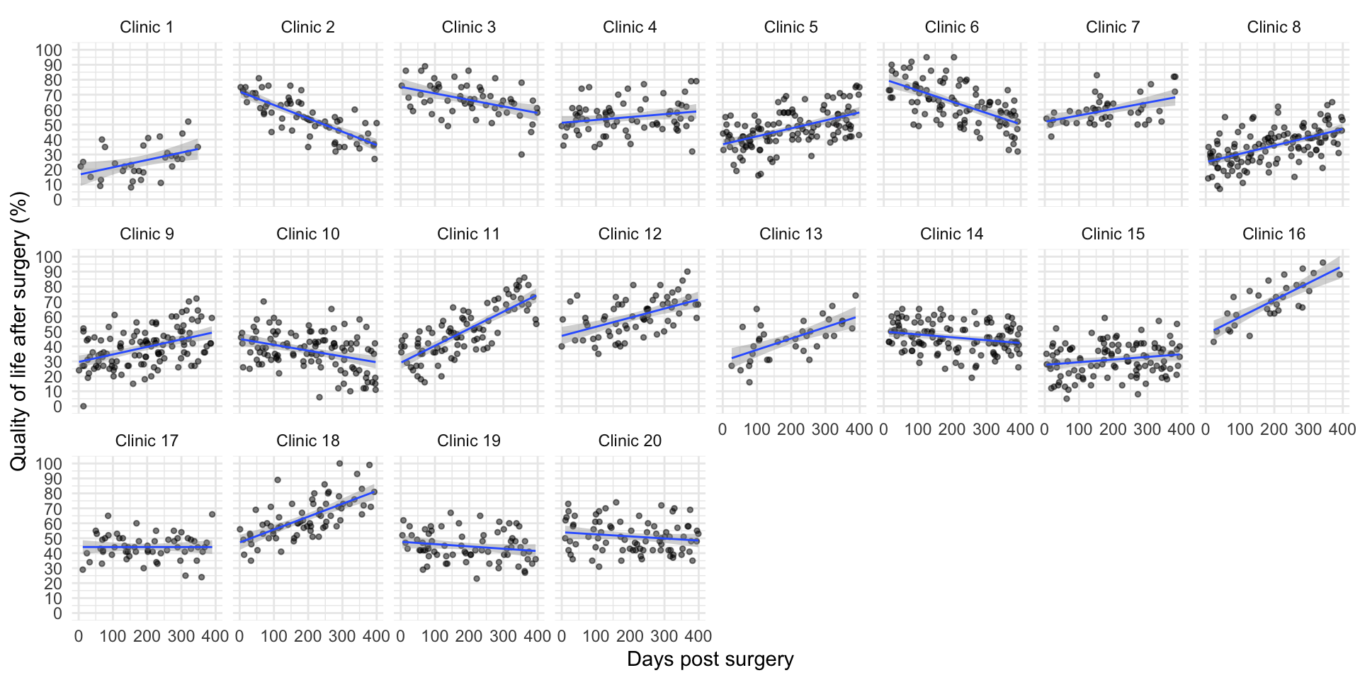 id: the participant’s participant codepost_qol: This is the outcome variable and it measures quality of life after cosmetic surgery.base_qol: We need to adjust our outcome for quality of life before the surgery.days: The number of days after surgery that post-surgery quality of life was measured.clinic: This variable specifies which of 21 clinics the person attended to have their surgery.reason: This variable specifies whether the person had surgery purely to change their appearance or because of a physical reason.Let’s start with ….