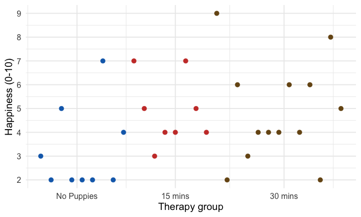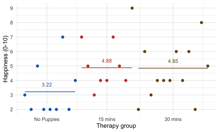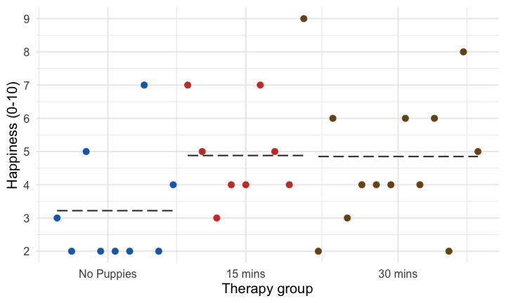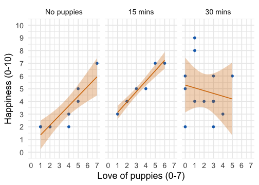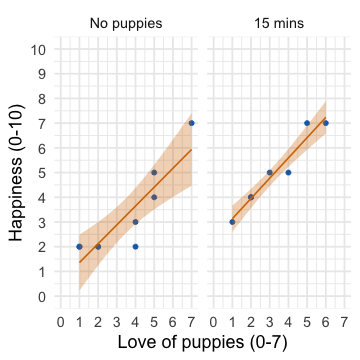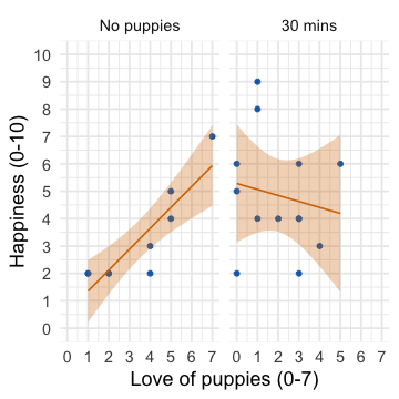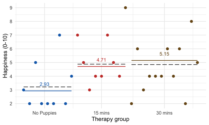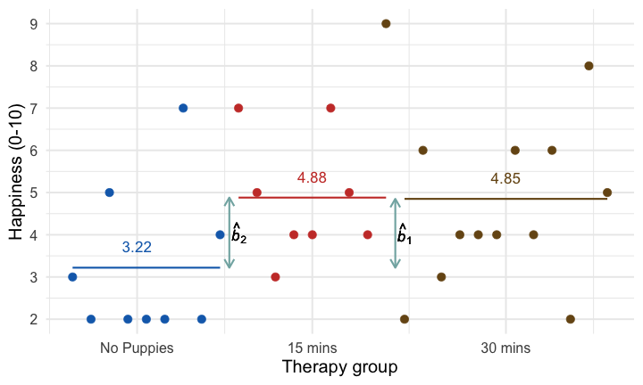 The dose of puppy therapy also significantly predicted happiness. Compared to no puppy controls, happiness was significantly higher after both 15 minutes, *b* = 1.79 [0.04, 3.53], *t* = 2.10, *p* = 0.045, and 30 minutes, *b* = 2.22 [0.57, 3.88], *t* = 2.77, *p* = 0.010, of therapy. ] --- ## Adjusted means ```r modelbased::estimate_means(pupluv_lm, fixed = "puppy_love") ``` .center[ <table> <thead> <tr> <th style="text-align:left;"> dose </th> <th style="text-align:right;"> puppy_love </th> <th style="text-align:right;"> Mean </th> <th style="text-align:right;"> SE </th> <th style="text-align:right;"> CI_low </th> <th style="text-align:right;"> CI_high </th> </tr> </thead> <tbody> <tr> <td style="text-align:left;"> No puppies </td> <td style="text-align:right;"> 2.73 </td> <td style="text-align:right;"> 2.93 </td> <td style="text-align:right;"> 0.60 </td> <td style="text-align:right;"> 1.70 </td> <td style="text-align:right;"> 4.15 </td> </tr> <tr> <td style="text-align:left;"> 15 mins </td> <td style="text-align:right;"> 2.73 </td> <td style="text-align:right;"> 4.71 </td> <td style="text-align:right;"> 0.62 </td> <td style="text-align:right;"> 3.44 </td> <td style="text-align:right;"> 5.99 </td> </tr> <tr> <td style="text-align:left;"> 30 mins </td> <td style="text-align:right;"> 2.73 </td> <td style="text-align:right;"> 5.15 </td> <td style="text-align:right;"> 0.50 </td> <td style="text-align:right;"> 4.12 </td> <td style="text-align:right;"> 6.18 </td> </tr> </tbody> </table> ] -- <br> .infobox[
