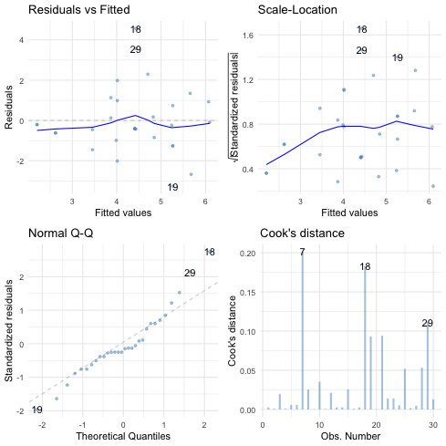 The dose of puppy therapy also **did not** significantly predicted happiness. Robust estimates showed that compared to no puppy controls, happiness was not significantly higher after 15 minutes, *b* = 1.86, *t* = 0.70, *p* = 0.489, or 30 minutes, *b* = 1.40, *t* = 0.80, *p* = 0.431, of therapy. ] --- background-image: url("media/milton_20190627_072357_crop.jpg") background-size: cover # Heteroscedasticity consistent standard errors ```r parameters::model_parameters(pupluv_lm, vcov = "HC4") ``` .whitebox[.center[ <table> <thead> <tr> <th style="text-align:left;"> Parameter </th> <th style="text-align:right;"> Coefficient </th> <th style="text-align:right;"> SE </th> <th style="text-align:right;"> CI </th> <th style="text-align:right;"> CI_low </th> <th style="text-align:right;"> CI_high </th> <th style="text-align:right;"> t </th> <th style="text-align:right;"> df_error </th> <th style="text-align:right;"> p </th> </tr> </thead> <tbody> <tr> <td style="text-align:left;"> (Intercept) </td> <td style="text-align:right;"> 1.789 </td> <td style="text-align:right;"> 0.544 </td> <td style="text-align:right;"> 0.95 </td> <td style="text-align:right;"> 0.671 </td> <td style="text-align:right;"> 2.908 </td> <td style="text-align:right;"> 3.288 </td> <td style="text-align:right;"> 26 </td> <td style="text-align:right;"> 0.003 </td> </tr> <tr> <td style="text-align:left;"> puppy_love </td> <td style="text-align:right;"> 0.416 </td> <td style="text-align:right;"> 0.190 </td> <td style="text-align:right;"> 0.95 </td> <td style="text-align:right;"> 0.025 </td> <td style="text-align:right;"> 0.807 </td> <td style="text-align:right;"> 2.187 </td> <td style="text-align:right;"> 26 </td> <td style="text-align:right;"> 0.038 </td> </tr> <tr> <td style="text-align:left;"> dose15 mins </td> <td style="text-align:right;"> 1.786 </td> <td style="text-align:right;"> 0.493 </td> <td style="text-align:right;"> 0.95 </td> <td style="text-align:right;"> 0.772 </td> <td style="text-align:right;"> 2.800 </td> <td style="text-align:right;"> 3.619 </td> <td style="text-align:right;"> 26 </td> <td style="text-align:right;"> 0.001 </td> </tr> <tr> <td style="text-align:left;"> dose30 mins </td> <td style="text-align:right;"> 2.225 </td> <td style="text-align:right;"> 0.690 </td> <td style="text-align:right;"> 0.95 </td> <td style="text-align:right;"> 0.807 </td> <td style="text-align:right;"> 3.642 </td> <td style="text-align:right;"> 3.226 </td> <td style="text-align:right;"> 26 </td> <td style="text-align:right;"> 0.003 </td> </tr> </tbody> </table> ]] -- <br> .infobox[